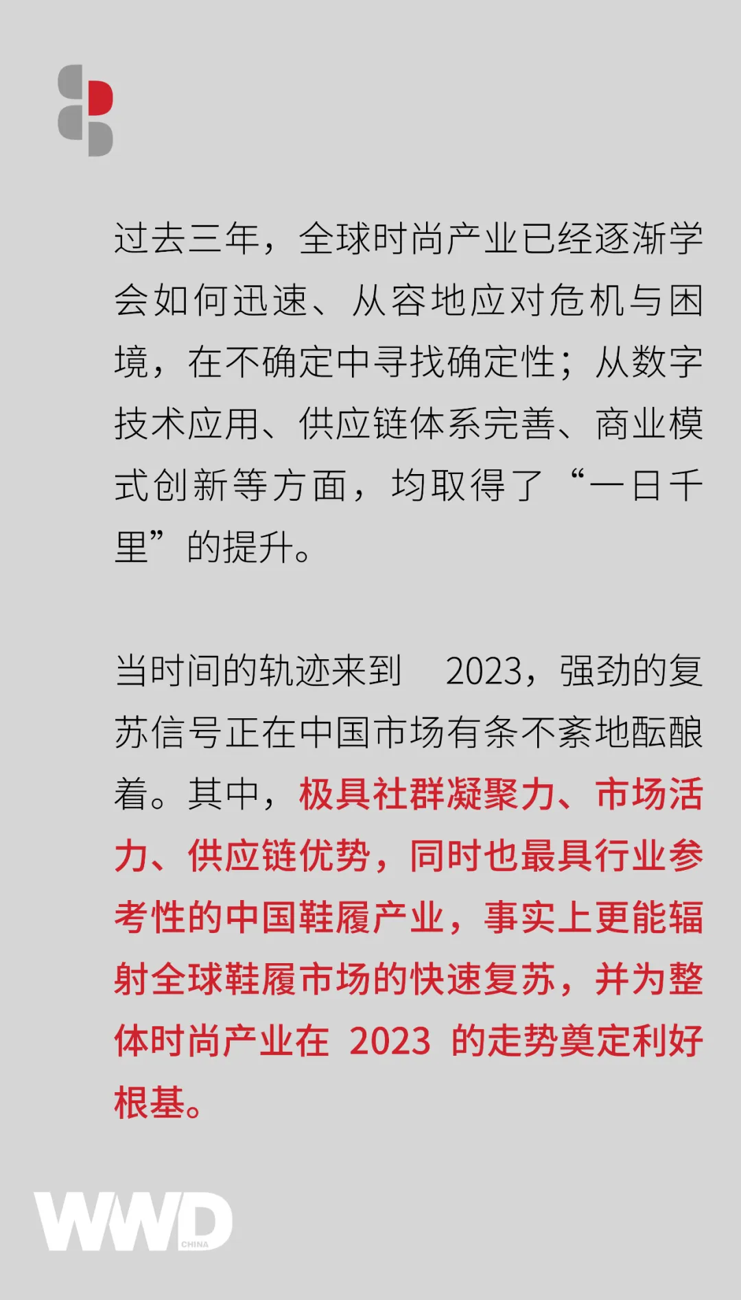 鉴于中国市场、尤其是中国鞋履制造、销售网络的长期优势,随 2023 而来的强劲复苏势头,也正在成为国内外鞋履企业的关键推动力。