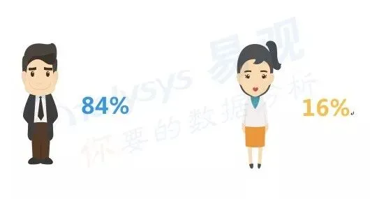 根据易观万像监测数据显示,男性群体占据二手车电商平台用户的主体,占比达到了84%。