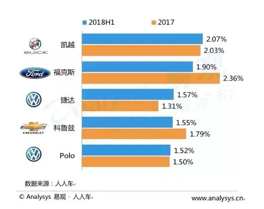 根据人人车平台二手车交易数据显示,在2017年和2018年上半年前五名交易量的车系中,美系三巨头和大众旗下的Polo、捷达始终占据前五名,但具体排名和份额有了一定变化。2018年受到中美贸易战影响,以福克斯、科鲁兹为代表的美系二手车的市场份额出现一定下滑。