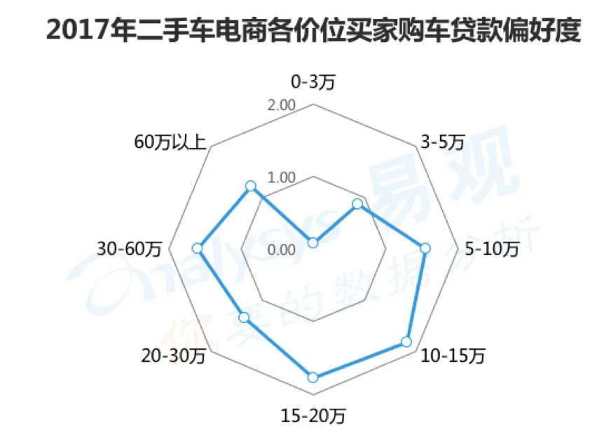 同时在贷款期限选择上,接近90%的金融买家都选择3年的最长贷款期限。因此对二手车买家来说,低首付、长期限的贷款是首选。
