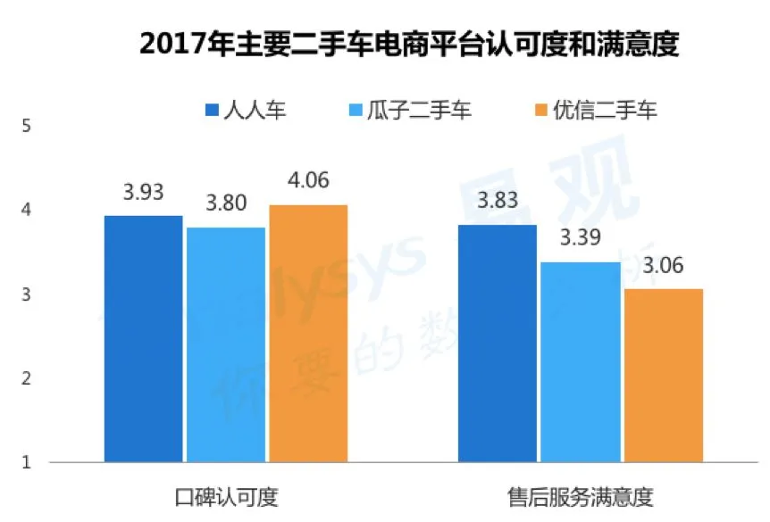 根据易观对二手车电商用户的调研数据显示,用户对主要二手车电商平台的口碑认可度、售后服务满意度总体持正面态度。