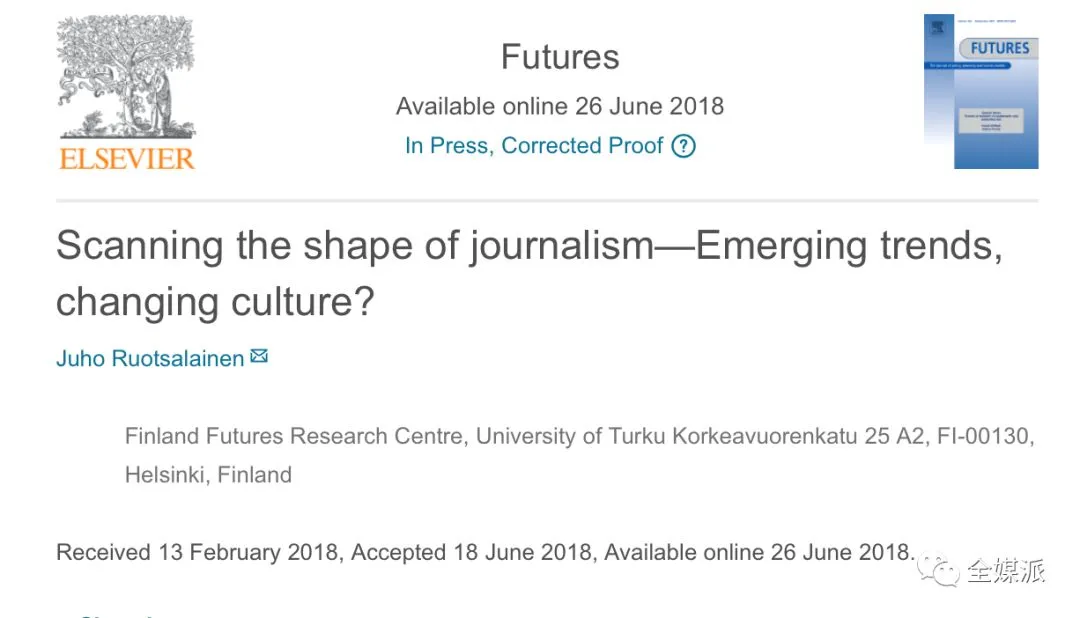 以往都是尼曼研究别人,这次,尼曼成为了“被研究对象”。芬兰未来研究中心(Finland Futures Research Centre)的博士生Juho Ruotsalainen基于尼曼实验室的新闻预测相关内容,探讨了“专家们如何洞察新闻现状和未来”,以这种方式提供“预测新闻业未来的分析框架”