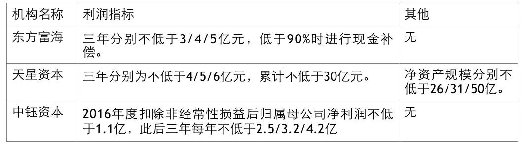 东方富海股价47.94亿元,较账面价值增值率177.21%,按照2016年时候净利润2.16亿元,市盈率接近22.19X;天星资本估值50亿元,税后净利润2.76亿元,市盈率接近18.12X。