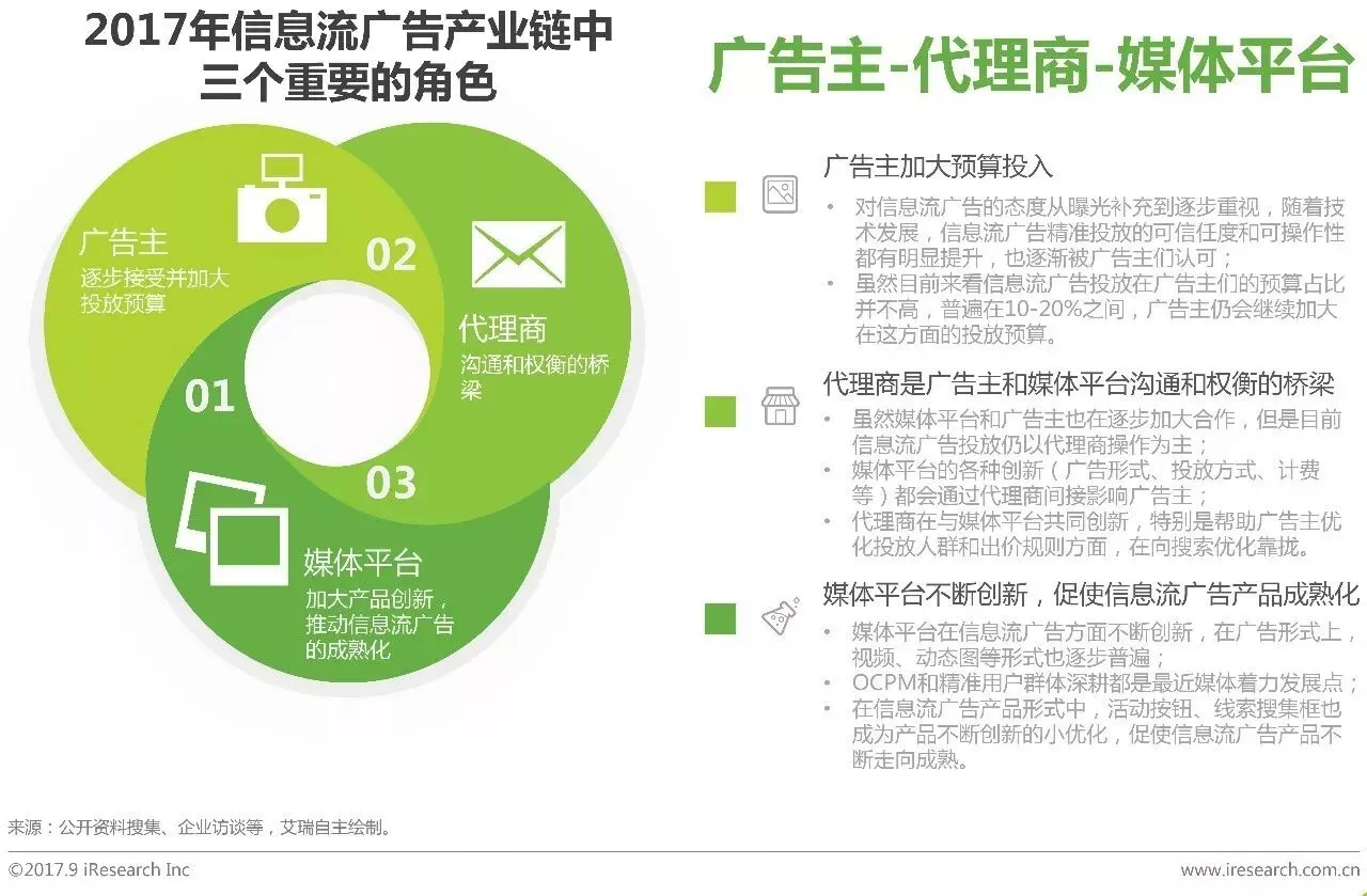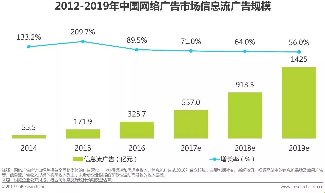 信息流广告仍处于快速发展阶段,预计2017年信息流广告市场规模达到557亿元,占整体网络广告市场的14.3%,未来三年内仍将保持50%以上速率增长。