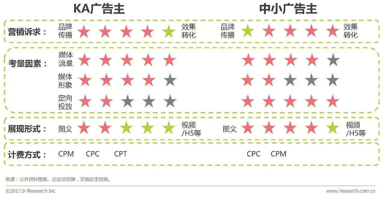 信息流对于KA广告主来说是整合营销的一部分,承载的品牌传播作用相对中小企业更为显著,因此在广告展现形式上对创意/素材的要求也相对较高。除了媒体流量规模,媒体形象也是KA选择投放平台的重要考量因素,而中小企业更注重流量转化,因此更注重精准定投来提升ROI。