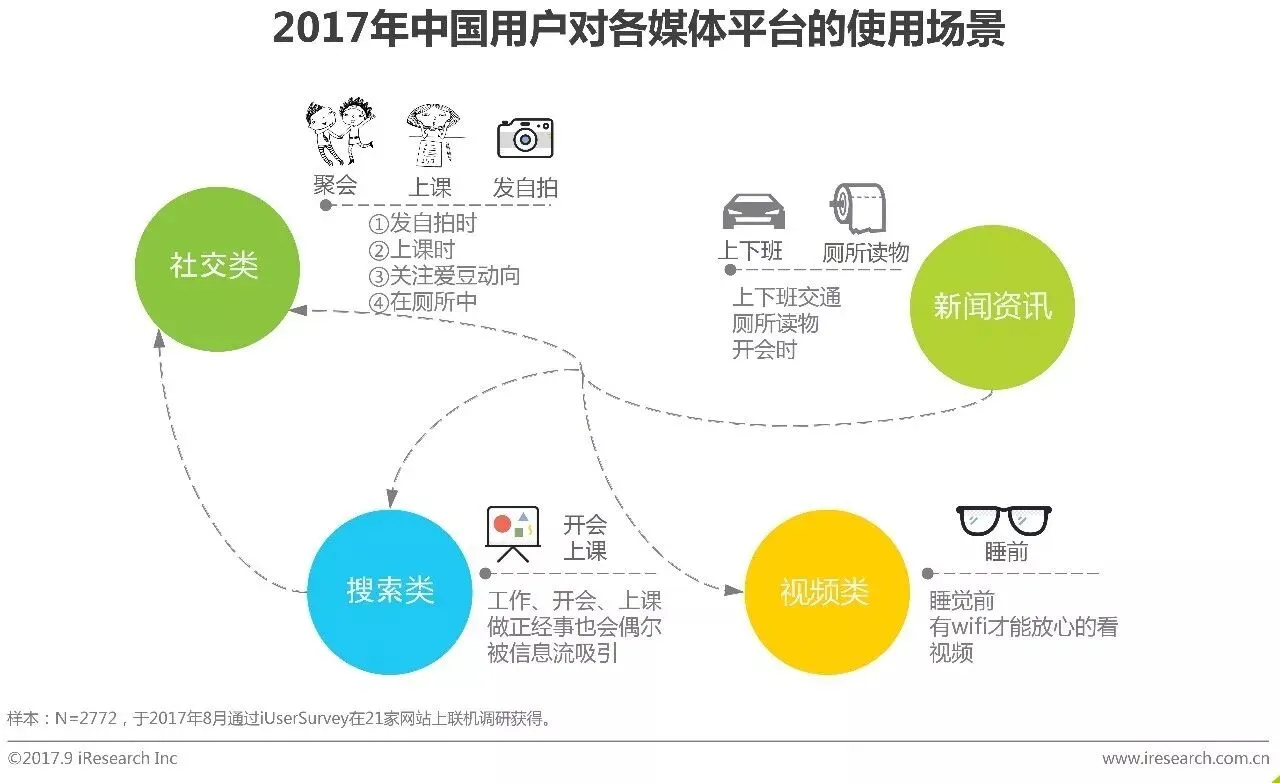 工作休息和等待时,是最常见的应用的使用场景,但是除此之外,社交类在发自拍和聚会和上课时最常用,新闻类应用在上下班交通和厕所读物最常用。视频再睡觉前看个视频,工作时、开会和上课时顺便看个搜索信息流.