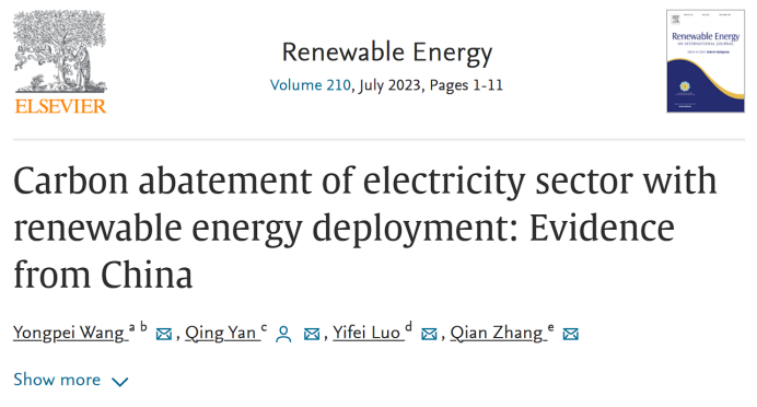 Wang,Y.,Yan,Q.,Luo,Y.,Zhang,Q.Carbon abatement of electricity sector with renewable energy deployment: Evidence from China,Renewable Energy,2023,doi:10.1016/j.renene.2023.04.032.