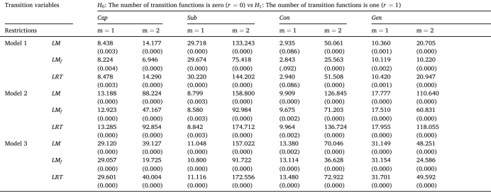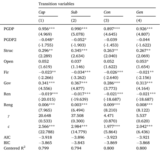 对于PSTR模型,表1是相应的结果。原假设为转移函数个数为0 (r = 0),备择假设为1 (r = 0),即拒绝原假设意味着至少存在一个转移函数,从而证明PSTR模型是正确的。考虑到过渡变量,表1给出了四种类型的过渡变量的判断结果。在1%的显著性水平下拒绝了PSTR模型中不同过渡变量的所有原假设,说明以发电装机容量、变电所设备容量、总用电量和总发电量为过渡变量的可再生能源发电份额与电力相关碳排放之间的非线性关系是必要的。
