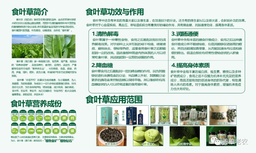 国家“粮袋子”、“菜篮子”民生工程至关重要。食叶草是非粮作物,是创新的经济作物,是国家新食品原料,通过实际应用得以证明,可担当新粮源和蔬菜新成员的重任,极有利、且有效应对突发公共事件,稳价保质为市场提供充足的供应。