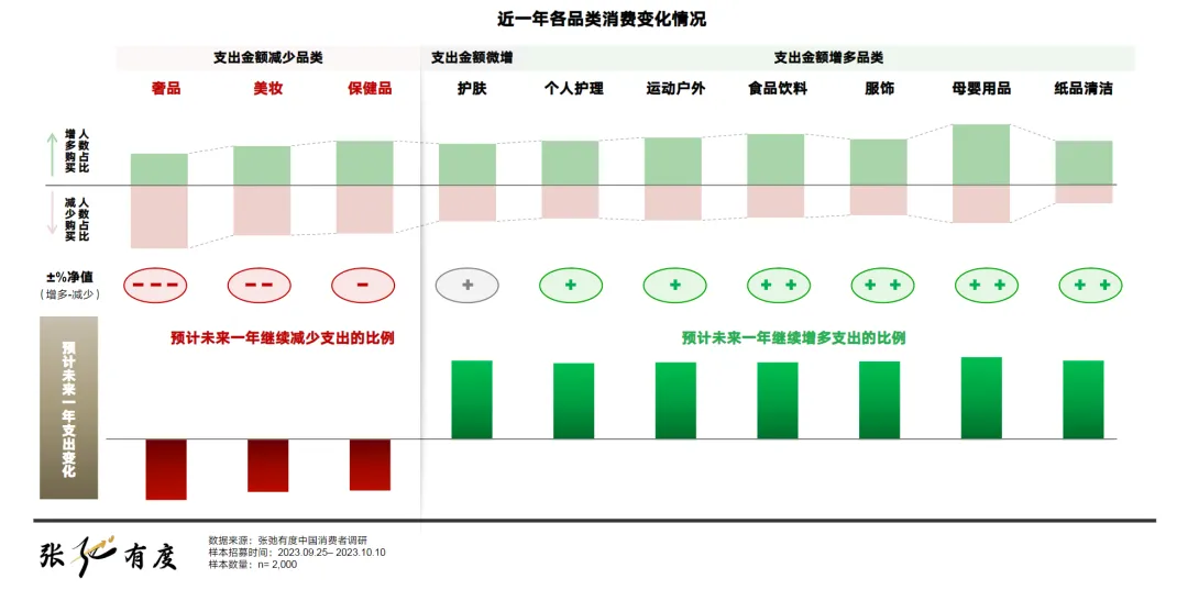 - 品质点缀类(Nice to have):护肤、个护,以及运动户外上增多花费和减少支出的消费者并存,因此整体增长有限;