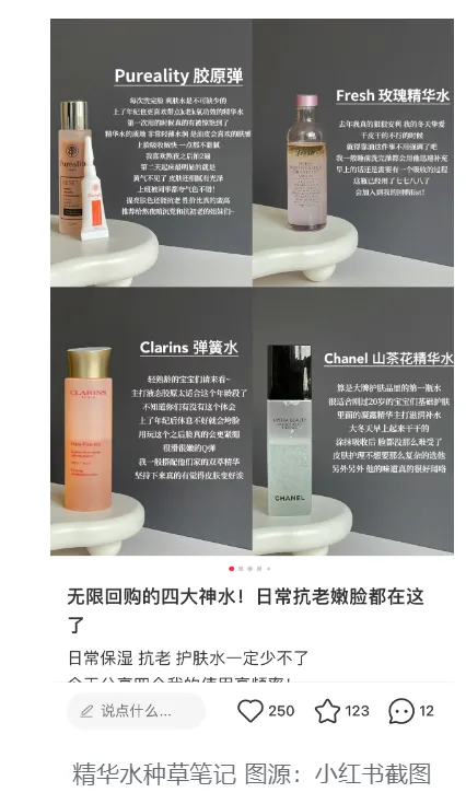 对于产品矩阵拥有精华水产品的客户来说,如何打好手中的牌很大程度上决定于是否有足够强的能力说清楚品类的故事和卖点,帮助消费者以最小的认知成本进入这个品类。当然品类教育的工作还需要和平台的通力合作,毕竟大多数平台都还没有将精华水列为一个独立的品类,商品往往部分在精华类目下,部分在爽肤水类目下,品类的定义不清一定程度上也造成了消费者的认知偏差。