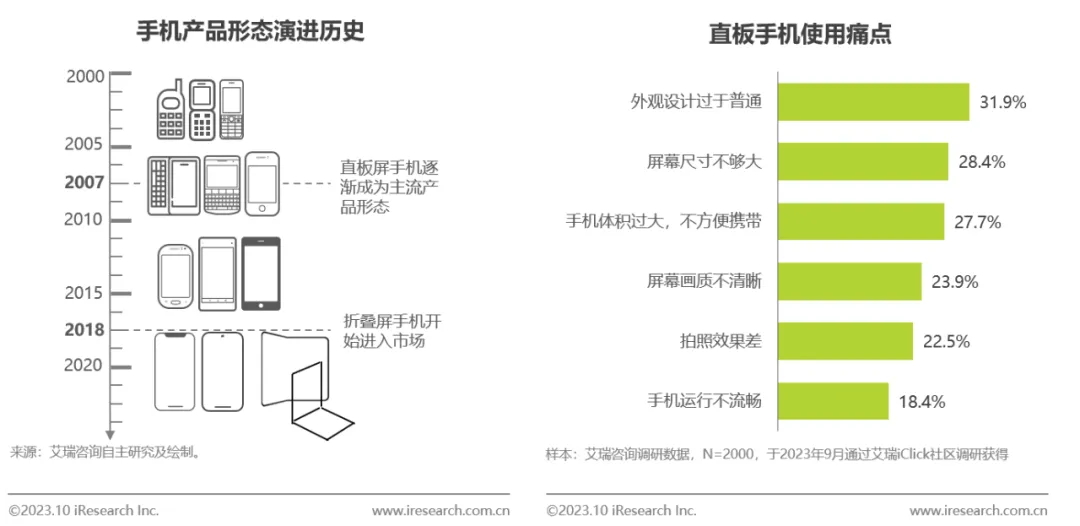 自2007年开始,直板屏智能手机凭借着全新的工业设计,在兼顾携带性和使用便捷性的同时,为用户带来革新性的人机交互体验,逐渐成为智能手机设计的主流产品形态。伴随着手机行业的发展和智能手机使用的普及,用户在使用体验上逐渐提出了更高的要求。调研发现,直板屏手机用户目前最大的使用痛点为千篇一律的手机外形,同时也对手机便携性及屏幕规格提出更高要求。而折叠屏手机通过创新性的产品设计,利用折叠、展开的产品形态,在兼顾便携性的同时,更大程度上满足了用户的体验需求,促使折叠屏成为手机行业发展的新趋势。