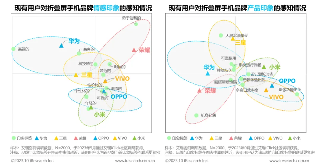 对于市场上不同品牌的折叠屏手机产品,用户已形成了相对清晰的品牌印象标签:如华为、三星偏向高端商务,拥有可靠耐用且运行流畅的系统;荣耀偏向科技创新,配备有突破科技壁垒的轻薄机身;而VIVO、OPPO和小米则更加年轻化、具有性价比优势,在影像功能和外观设计上更为出色。