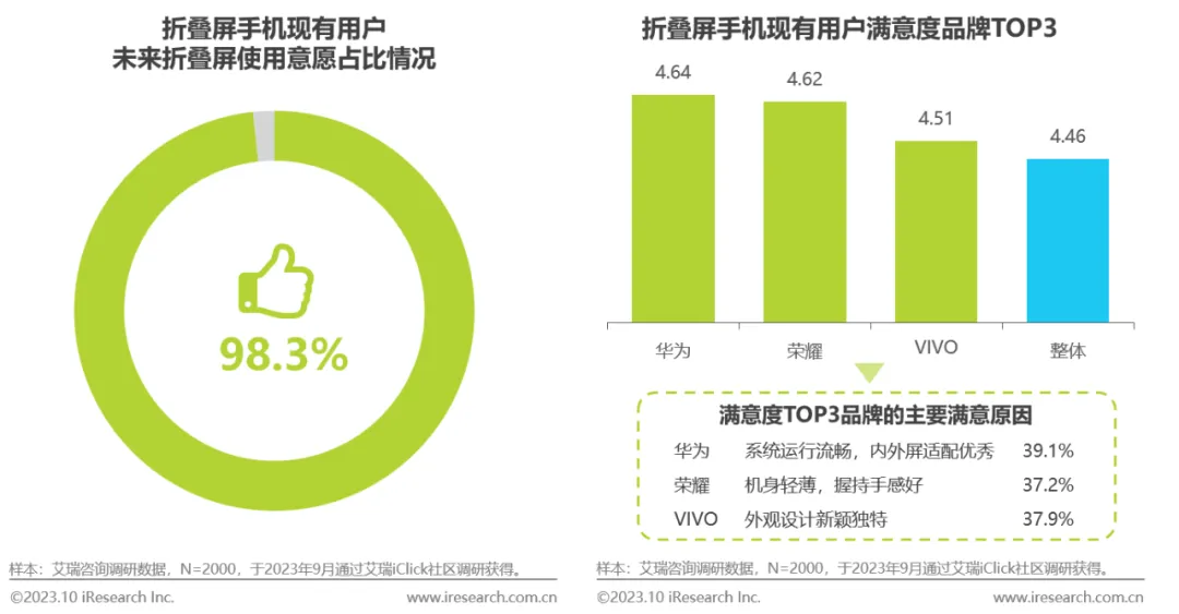 在折叠屏现有用户中,表示未来将继续使用折叠屏手机的用户比例高达98.3%,用户粘性较高,未来增长空间可期。在品牌满意度上,华为、荣耀与VIVO的用户满意度远高于整体均值。在用户满意原因上,华为主要为配置了优秀且运行流畅的系统,荣耀主要为其轻薄的持握体验,VIVO则为独特新颖的外观设计。