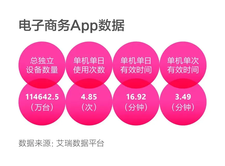 今年5月,电子商务App月度总独立设备数为114642.5万台,单机单日使用次数为4.85次,单机单日有效时间为16.92分钟,单机单次有效时间为3.49分钟。