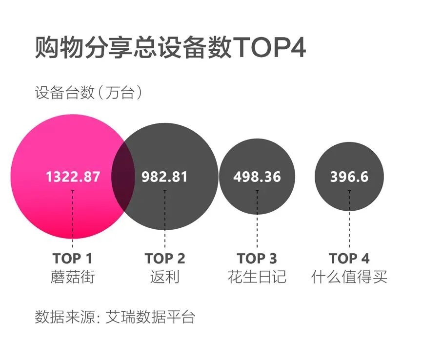 其中,在电子商务所属的“购物分享”类别中,蘑菇街、返利、花生日记、什么值得买月度总独立设备数位列前四。