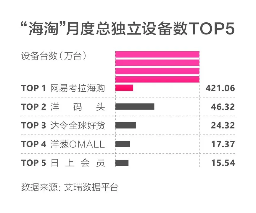 在“海淘”类别中,网易考拉海购、洋码头、达令全球好货、洋葱omall、日上会员月度总独立设备数位列前五。