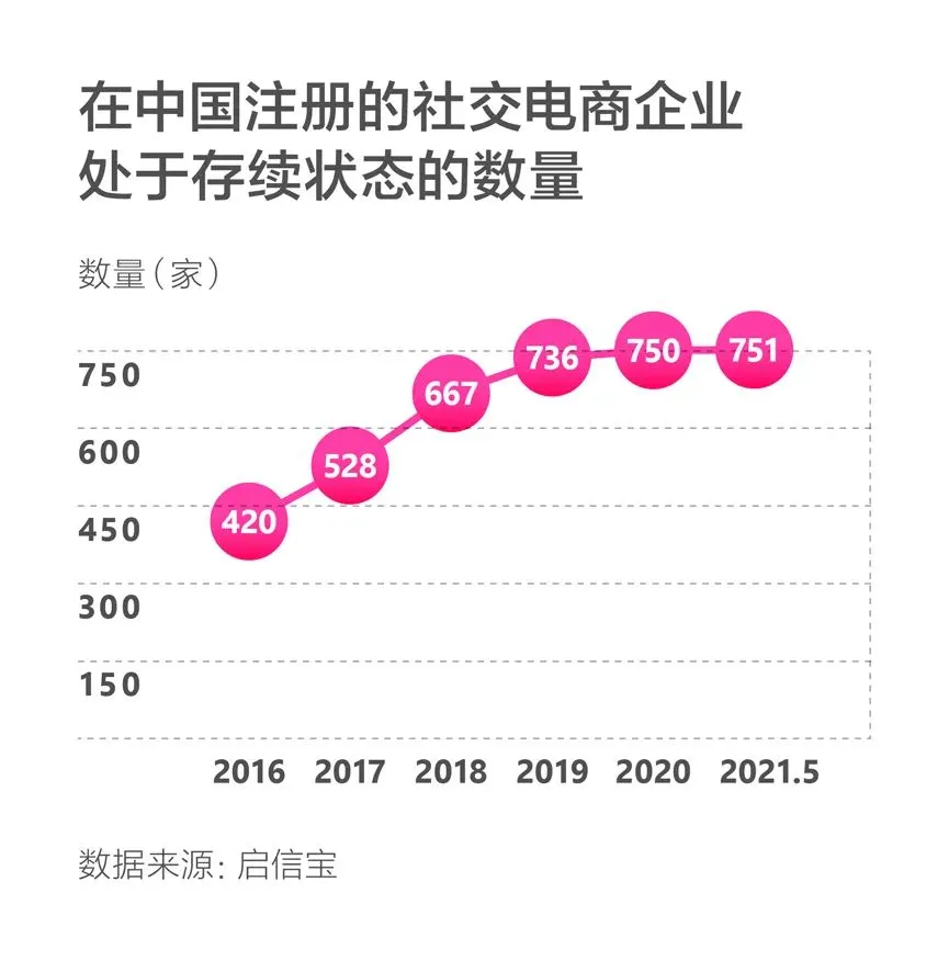 截至2021年5月底,在中国注册的社交电商企业存续状态的数量有751家,其中大多数在2017年和2018年注册成立,注册资本集中在100万到1000万元之间,仅少部分企业注册资本超过1000万元。