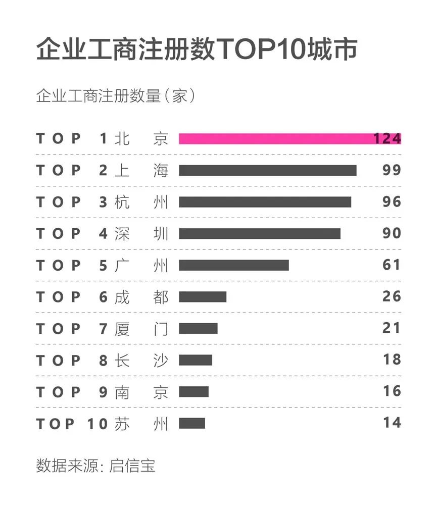 企业工商注册地址主要集中在一线、强二线城市,前10名城市分别为北京、上海、杭州、深圳、广州、成都、厦门、长沙、南京、苏州。