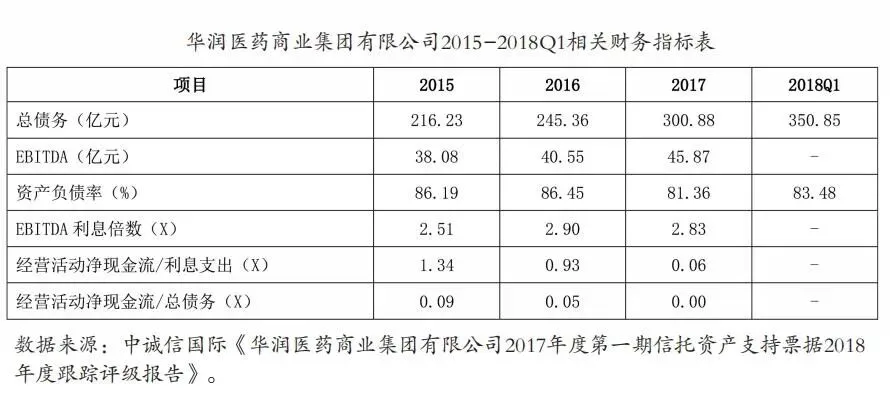 由于医药流通企业下游医院占款和上游厂家压库存,导致经营资金被大量占用,企业只能向外部融资以补充流动资金,使医药流通企业的财务风险较高。以我国医药流通行业市场排名前三的华润医药商业集团有限公司为例,如表所示,从债务规模来看,华润医药商业资产负债率一度高达86.45%,其债务规模快速上升,到2018年Q1总债务达到350.85亿元,短期债务比例达到98.77%。经营现金流量波动较大,对利息和债务保障不足。从行业领先企业的偿债风险水平及其对债务融资的依赖程度,可以看出行业整体财务风险较高的现状。