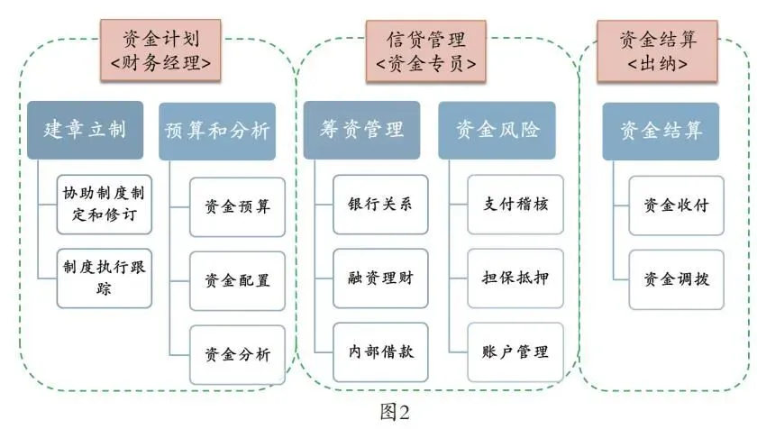 进一步明确资金工作分工和岗位职责,建立“三线”岗位责任制,加强稽核监督,以提高协作效率和强化风险控制。财务经理岗主要职责是协助建章立制、开展预算管理与分析,包括协助制度制定和修订、制度执行跟踪、资金预算管理、资金配置管理、资金运行分析;资金专员岗主要职责是协助筹资管理和控制资金相关风险,包括银行关系维护、融资品种商谈、理财业务管理、内部借款管理、支付稽核、担保抵押管理、银行账户管理;出纳岗主要职责是资金结算,包括资金收付和内部资金调拨。(如图2)