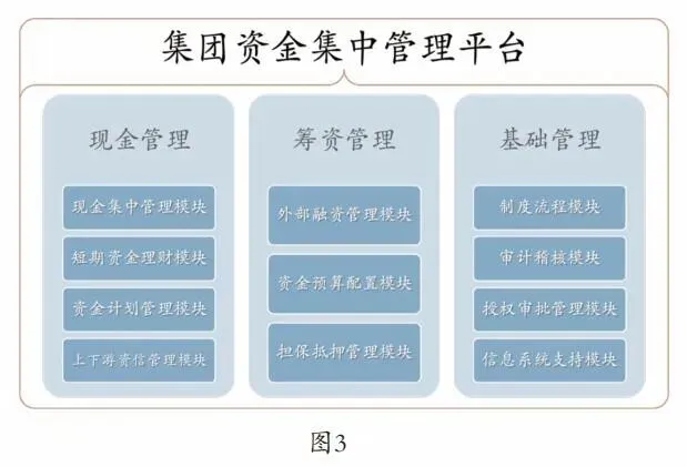 搭建了体系健全、运行高效的集团资金集中管理平台,平台具备现金管理、筹资管理、基础管理三大管理功能,具体包括:①现金集中管理、短期资金理财、资金计划管理、上下游资信管理;②外部融资管理、资金预算配置、担保抵押管理;③制度流程、审计稽核、授权审批管理、信息系统支持十一项功能子模块。(如图3)