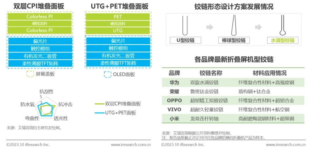 折叠屏手机成熟的关键在于硬件设备能否为手机的功能性、耐用性、便携性等方面提供有效支撑,尤其离不开折叠屏手机的两大组成部分——即屏幕与铰链。在屏幕的关键技术上,伴随着材料、技术的进步,现已形成多层薄膜封装的成熟应用方案,既有效保障了屏幕的视感和灵敏度,又显著增强了手机动态折叠的耐用性。在铰链的关键技术上,历经数次迭代优化,目前已形成折叠无缝的水滴型铰链设计方案。各品牌在此基础上不断迭代优化结构的设计和精进高强度材料的应用,如荣耀采用榫卯结构优化铰链结构并结合强度重量比更高的钛合金材料等,进一步保障了折叠屏铰链的稳固性、轻盈性。