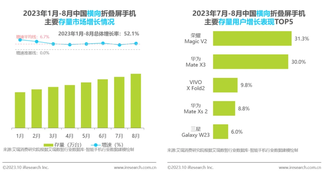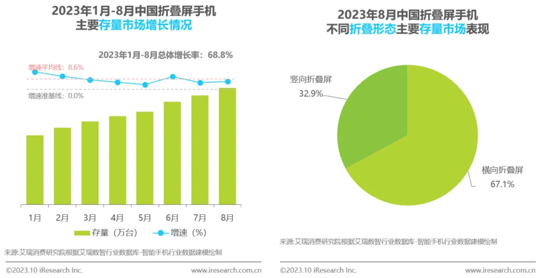 在中国智能手机行业低迷的大周期背景中,中国折叠屏手机存量市场在2023年1月-8月以8.6%的月均增速稳定增长,2023年前8月累计增长了68.8%的用户。