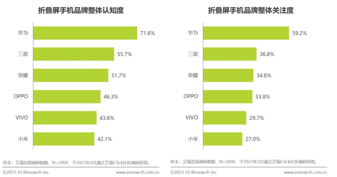 国内主要手机品牌厂商均已入局折叠屏赛道,形成“横折屏机型赛道千帆竞发,竖折屏机型赛道厉兵秣马“的竞争态势;消费者对各大厂商均有耳闻,并形成相对清晰的品牌印象标签。