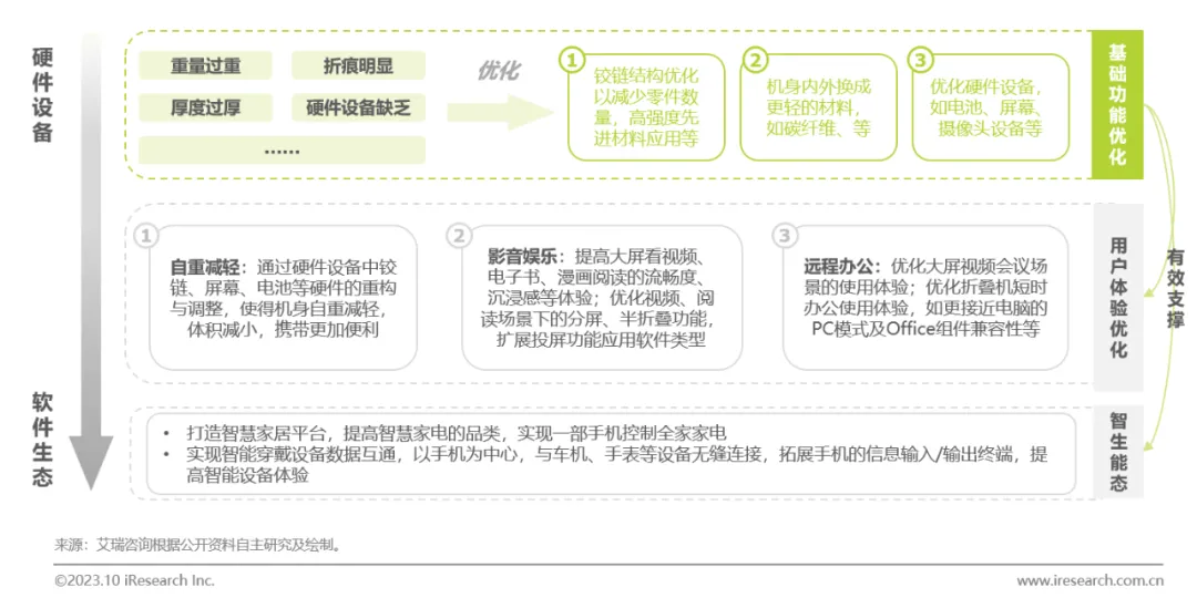 折叠屏手机硬件设备的基础性功能优化,是现阶段各折叠屏手机品牌厂商发展的重中之重。如荣耀、华为、OPPO等厂商通过前沿技术不断调整和研发铰链结构、电池材料、屏幕材质,进一步优化折叠屏手机在机身厚度、重量和折痕上的基础配置,为折叠屏手机的发展奠定根基,为未来折叠屏手机用户的体验持续优化和智能生态的完善提供有效支撑。