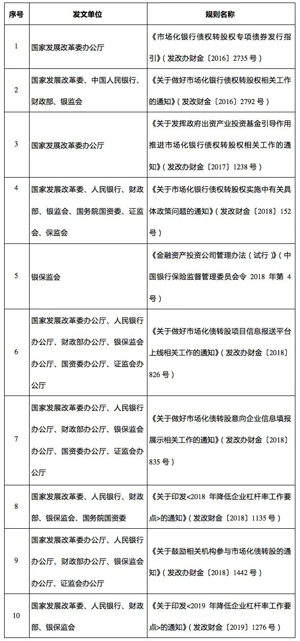 2016年10月10日,国务院发布《关于积极稳妥降低企业杠杆率的意见》(国发〔2016〕54号,以下简称“54号文”)及其附件《关于市场化银行债权转股权的指导意见》。此后,有关部门相继出台了一系列配套规则鼓励实施市场化债转股,包括但不限于: