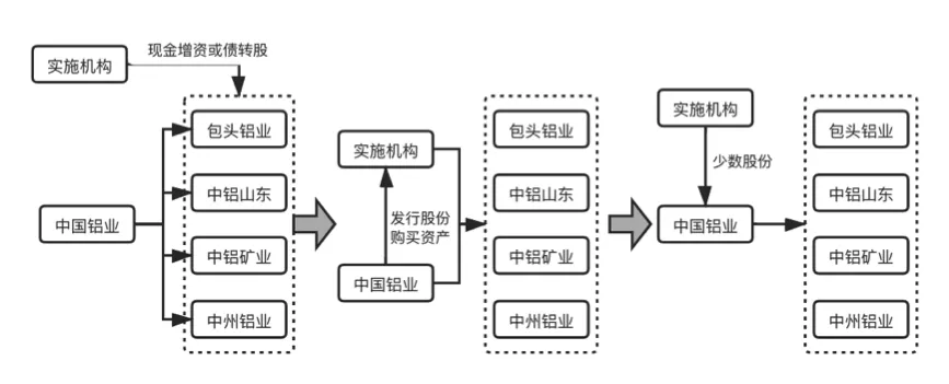 根据公开信息,此类利用实施机构进行债转股的案例在实践中日渐增多,例如中国铝业债转股案,有关交易图示见下述: