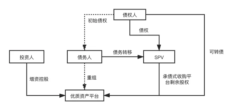 此种方式在本质上仍是银行直接实施股权投资,区别在于持股的对象变更为平台企业,近年来的典型案例包括东北特钢案(见图6)以及渤海钢铁案中钢铁资产部分(见图8)。