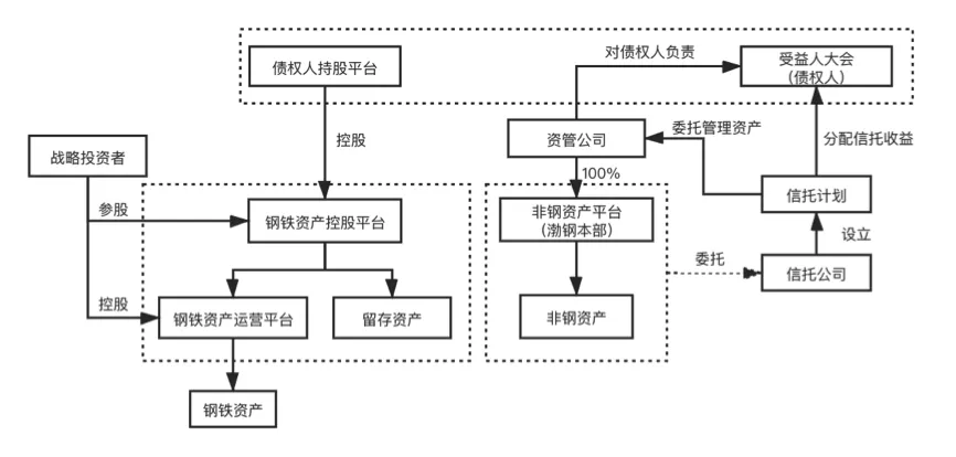 渤海钢铁案中对非钢资产对应债务的处理方式较为特别,有关债权人将其持有的债权转化为信托受益权,但此时渤海钢铁的原有股东完全退出,持有渤海钢铁(非钢资产平台)100%股权的主体为对债权人组成的受益人大会负责的资产管理公司,故此方案的效果是将渤海钢铁的非钢资产完全抵债给债权人,并由债权人委托专业管理机构进行经营并远期受偿。