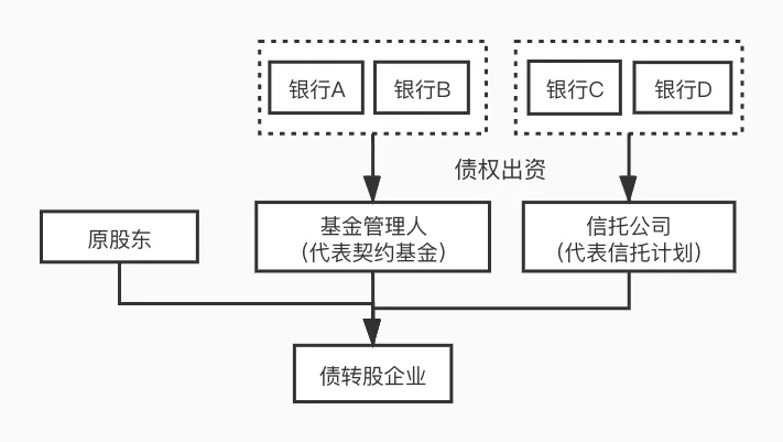 基于上述商业银行原则上不得投资企业股权的限制,可以考虑的变通方式是银行以债权认购不以企业形式存在的资管产品的份额,后续由资管产品的管理人/受托人具名实施债转股。从目前资管产品的类别看,契约型基金、资管计划、信托计划等均有机会搭建此类投资结构,从而避免商业银行直接具名持有债转股企业或有关平台企业的股权或合伙份额。有关交易图示可参见下述: