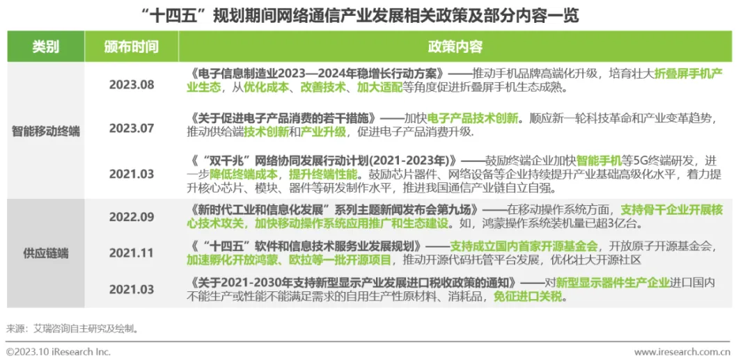 国家为推动消费升级,培育并壮大新增长点,提升产业链、供应链韧性和安全水平,为电子信息制造业经济稳增长提供强有力的支撑,近年来围绕着智能移动终端及其供应链产业颁发了多项指导性、激励性的政策。随着技术发展,政策从鼓励智能移动终端性能发展,逐渐扩展到优化产业生态上,进一步加快智能移动终端产业在折叠屏、芯片等关键核心技术上的创新和迭代应用,为智能移动终端产业的消费升级和创新发展提供优异的政策环境。