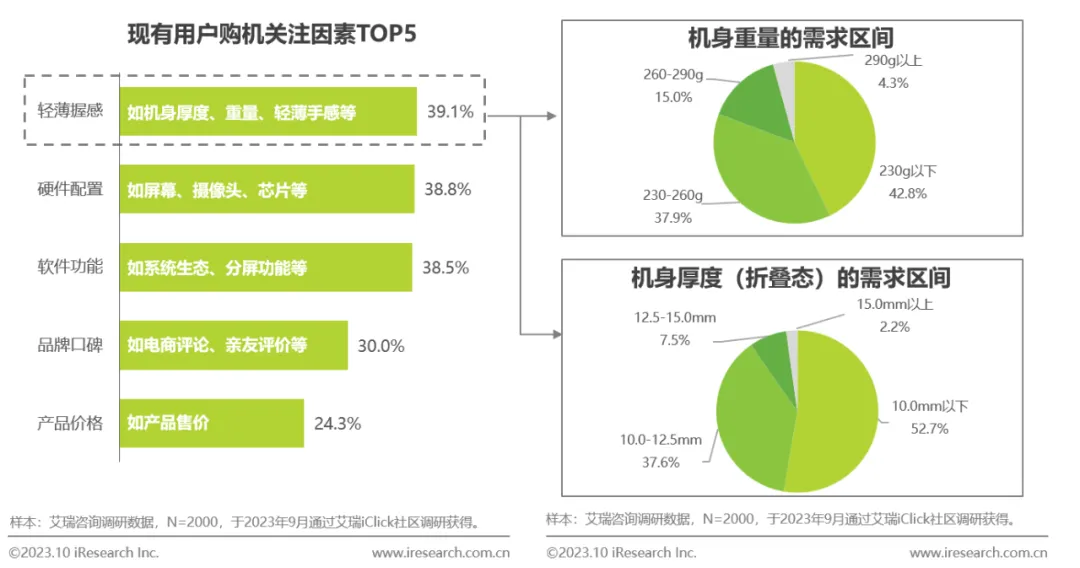 现有用户相对偏好230g以下和10.0mm以下的机身规格