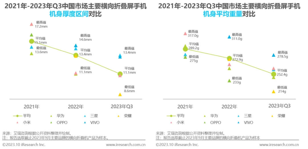 随着科技的进步与应用,各大厂商在轻量化复合碳纤维材料的应用方面日益成熟,并通过如荣耀V Purse的蝶翼铰链、荣耀Magic V2的鲁班钛金铰链和华为Mate X3的双旋水滴铰链等日益精简化的折叠屏铰链设计,以及如荣耀青海湖电池技术等硅碳负极电池新技术的应用,带动折叠屏手机在各方面性能提升,同时不断朝着轻薄化方向发展。从近年发布的横向折叠屏手机参数上来看,横向折叠屏手机的平均厚度和平均重量呈现明显下降的趋势,各大厂商不断突破横向折叠屏手机机身规格的极限,其中荣耀率先将横向折叠屏手机机身厚度降低至8.6mm,推动横向折叠屏手机迈入“毫米时代”。