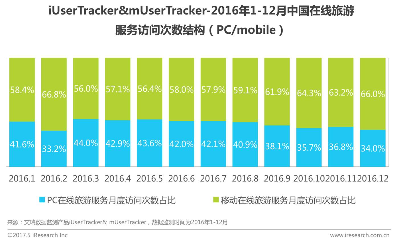 艾瑞监测数据显示,旅游用户在移动端的访问次数远高于PC端,移动端具有明显优势。2016年中国在线旅游移动端平均月度访次占比达60.4%,其中2月和12月移动端占比较高,均超过66%。艾瑞分析认为,移动端相较于PC端具有便携性,能够随时随地满足用户需求,因而能快速在用户人群中普及。