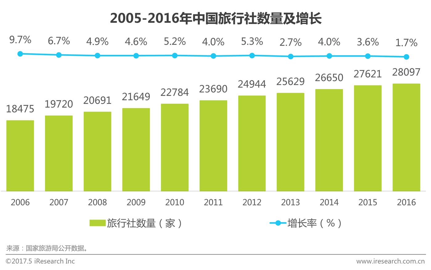 公开数据显示,截止2016年底,中国传统旅行社共计28097家,增长率为1.7%,传统旅行社仍然保持缓慢增长状态。