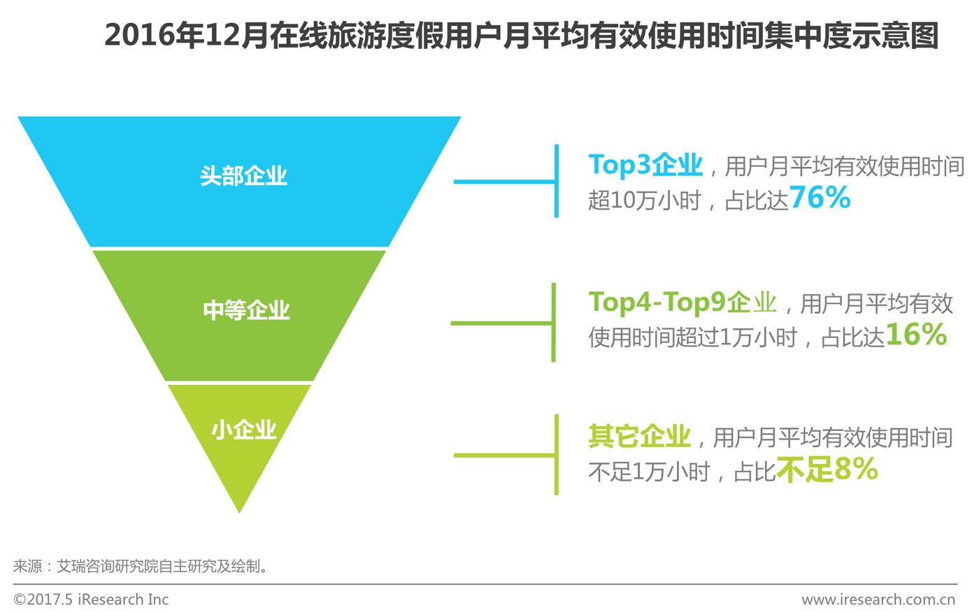 根据艾瑞mUserTracker监测数据,从用户使用时长占比来看:在线旅游度假行业移动端企业流量呈现倒金字塔结构,头部企业占据用户使用时长76%,中等企业占据16%,小企业占比不足8%。从流量角度来看,Top9企业流量占比为92%,市场高度集中。
