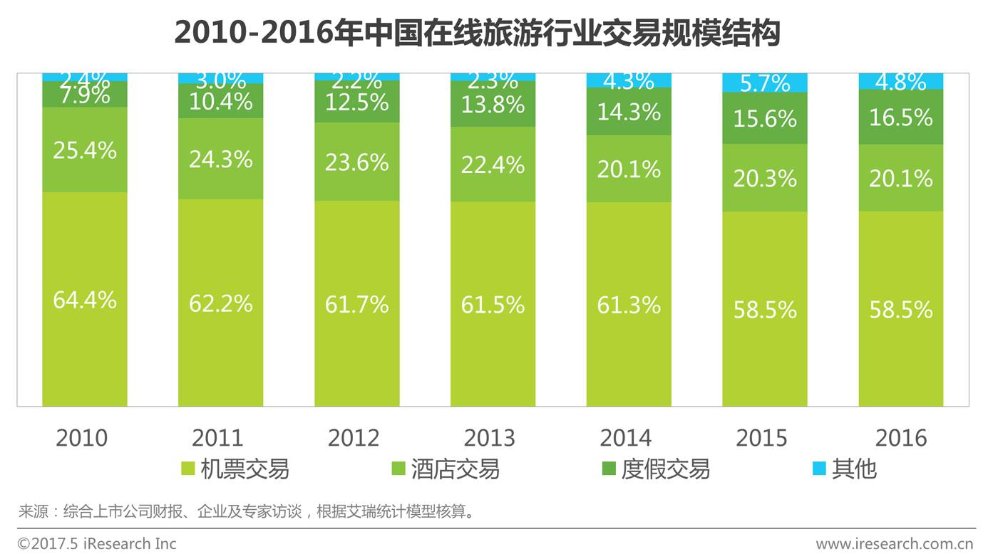2016年机票占比58.5%,其占在线旅游行业的比重较为稳定。机票是在线旅游市场中发展最为成熟的板块,随着在线度假及其他品类业务的上升,机票增速将相对放缓,比例出现下降趋势。