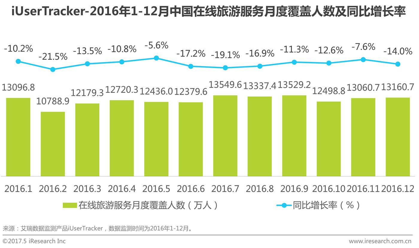 艾瑞监测数据显示,2016年在线旅游行业PC端月度覆盖人数整体稳定在1.2亿人上下,各月同比增长率均为负值,整体流量呈现下降趋势。艾瑞分析认为,随着人口红利的消退,以及用户行为全面移动化,PC端流量未来仍将持续下降。