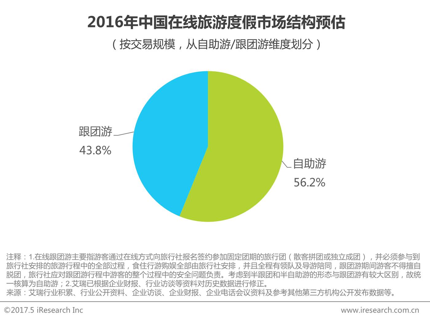 艾瑞数据显示,2016年中国在线度假市场结构同去年变化较小,在线自助游占比为56.2%,较去年上升了0.7个百分点;在线跟团游占比为43.8%,较去年下降了0.7个百分点。