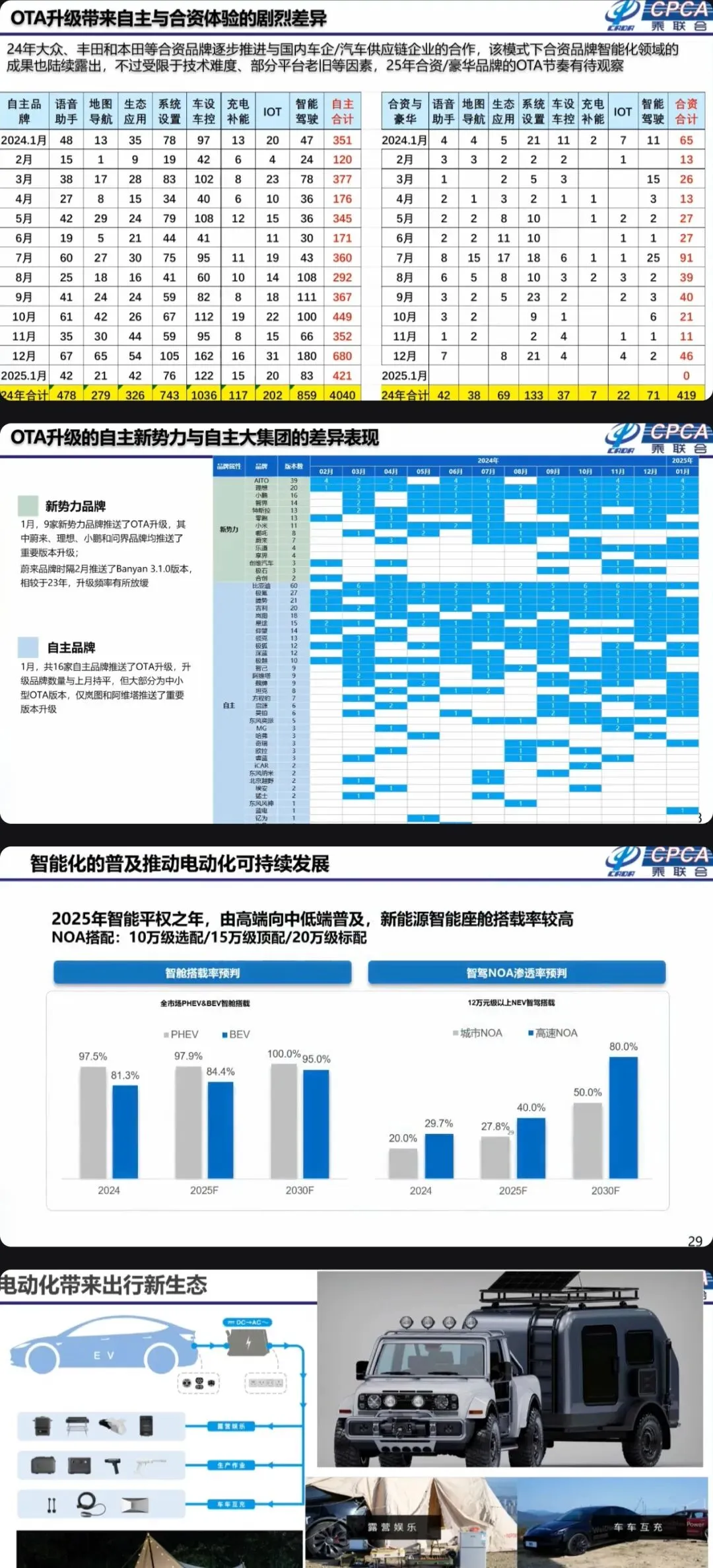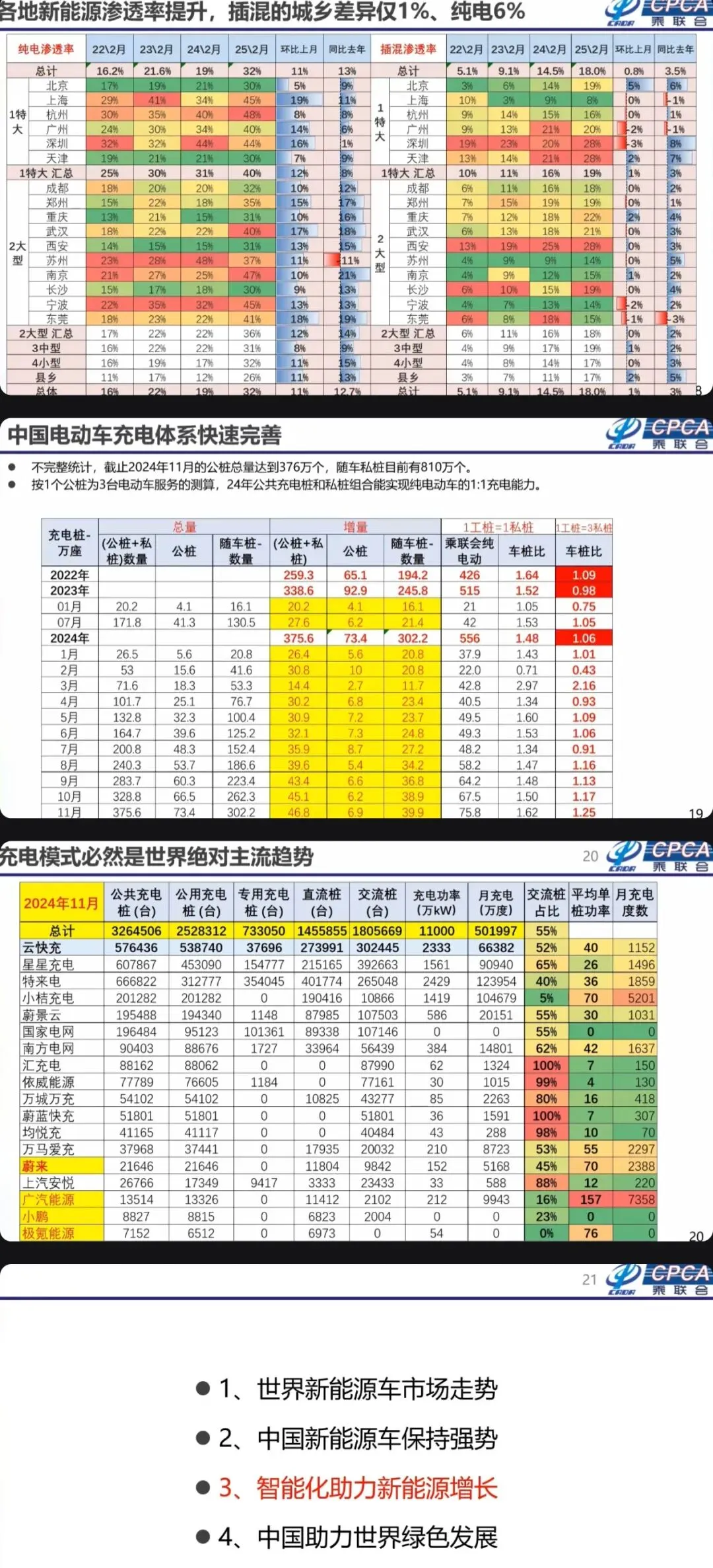 行业趋势上,智能化是核心驱动力:DeepSeek等大模型广泛融入智能座舱,吉利、奇瑞等多数车企选择技术融合,蔚小理等坚持自研,10万级车型选配NOA、20万级标配成为行业常态;充电模式主导补能生态,公共直流桩与交流桩规模庞大,车车互充、户外储能等新场景涌现。