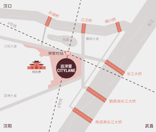 远洋里位处武汉市的几何圆心——汉阳的大归元片区,以归元寺为核心,通过十字轴线带动整个区域的发展。