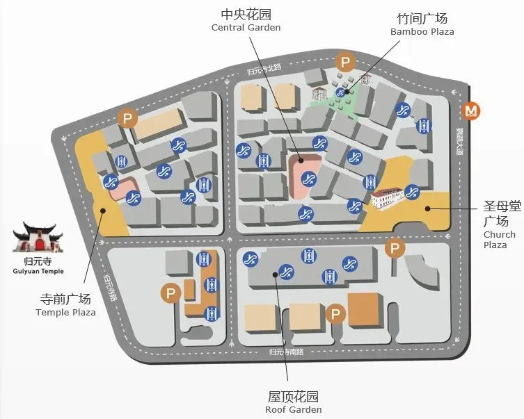 五大公共城市空间——寺前广场、圣母堂广场、竹间广场、中央花园、屋顶花园,两条横纵景观大道——西大街、翠微路,及七所庭院,以“点、线、面”的形式,共同构成了“移步换景”的大氛围。