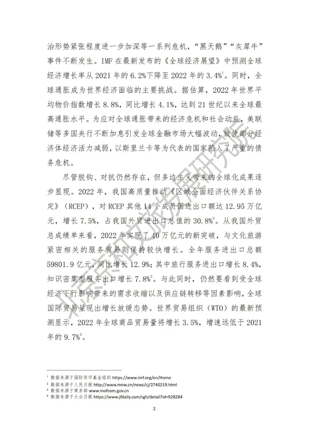 2022年,新冠病毒的全球大流行对世界经济的影响仍在持续,全球供应链逐渐呈现出区域化和本土化的趋势。自2月俄乌冲突以来,全球通胀,粮食、天然气等能源危机涌现,地缘政治形势紧张程度进一步加深,“黑天鹅”“灰犀牛”事件不断发生。IMF在最新发布的《全球经济展望》中预测全球经济增长率从2021年的6.2%下降至2022年的3.4%[1]。同时,全球通胀成为世界经济面临的主要挑战。据估算,2022年世界平均物价指数增长8.8%,同比增长4.1%,达到21世纪以来全球最高通胀水平。同时,全球国际贸易也呈现出增长放缓态势。世界贸易组织(WTO)的最新预测显示,2022年全球商品贸易量将增长3.5%,增速远低于2021年的9.7%[2]。二、文化旅游国际交流合作日益恢复,但不确定性仍然存在