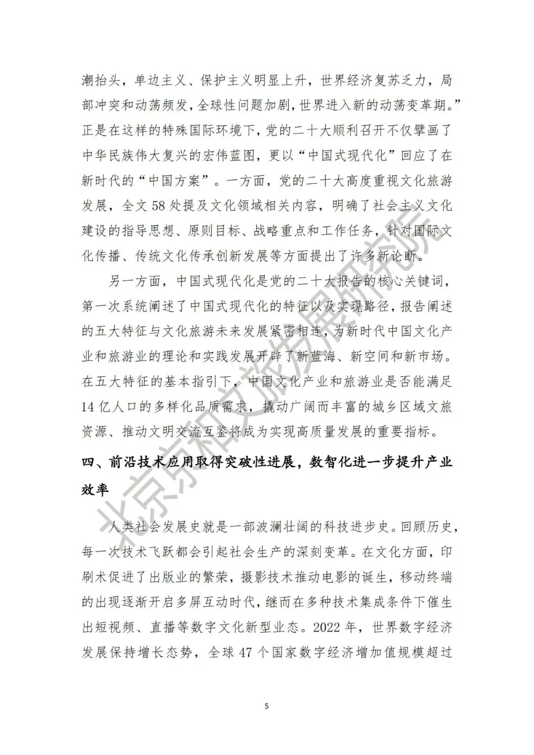 党的二十大报告指出,“世纪疫情影响深远,逆全球化思潮抬头,单边主义、保护主义明显上升,世界经济复苏乏力,局部冲突和动荡频发,全球性问题加剧,世界进入新的动荡变革期。”正是在这样的特殊国际环境下,党的二十大不仅擘画了中华民族伟大复兴的宏伟蓝图,更以“中国式现代化”回应了在新时代的“中国方案”。二十大报告全文共计58处提及文化领域相关内容,明确了社会主义文化建设的指导思想、原则目标、战略重点和工作任务。另一方面,报告提出的中国式现代化的五大特征与文化旅游未来发展紧密相连,未来中国文化产业和旅游业是否能满足14亿人口的多样化品质需求,撬动广阔而丰富的城乡区域各类资源将成为实现高质量发展的重要指标。四、前沿技术应用取得突破性进展,数智化进一步提升产业效率