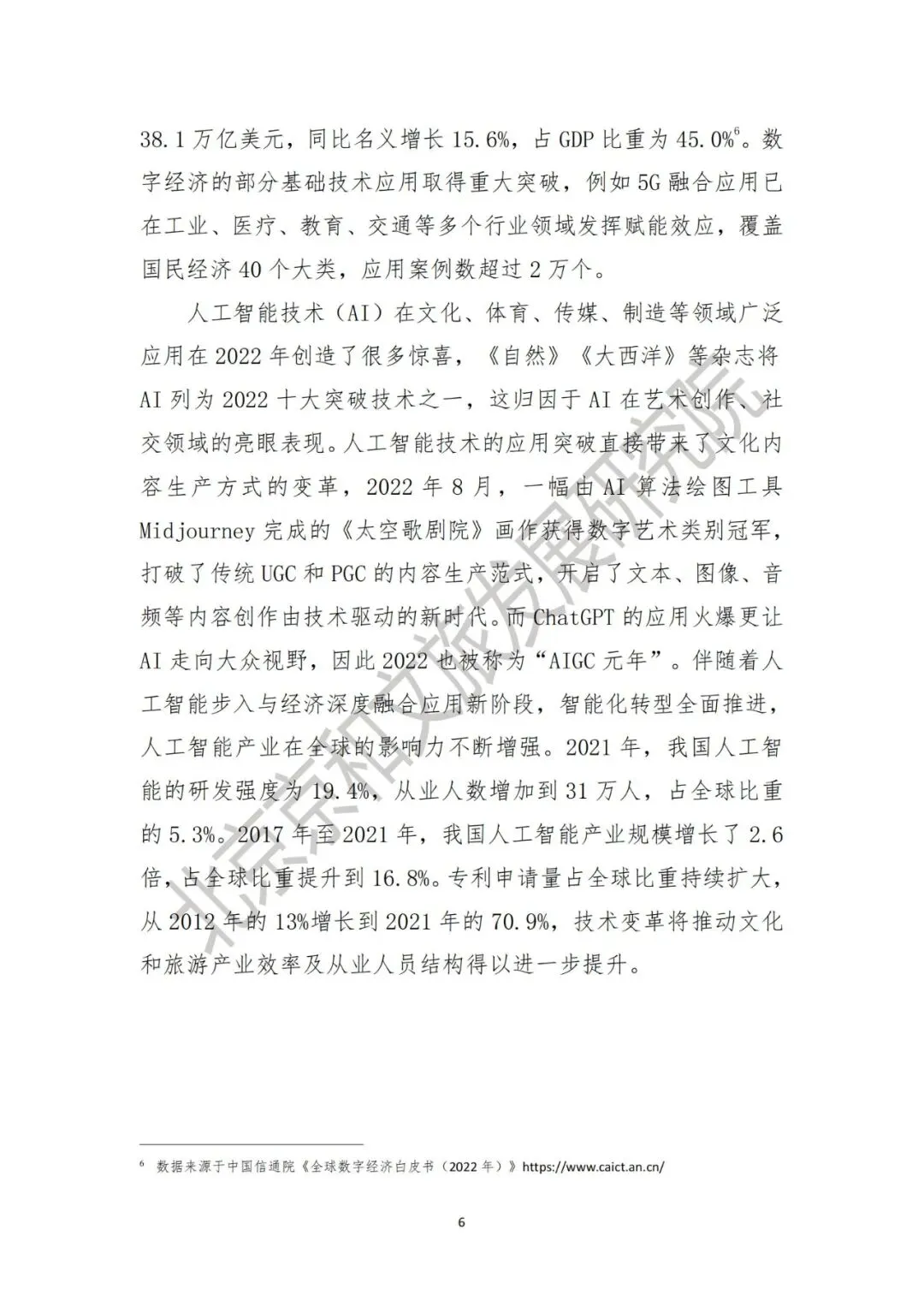 2022年,世界数字经济发展保持增长态势,全球47个国家数字经济增加值规模超过38.1万亿美元,同比名义增长15.6%,占GDP比重为45.0%[4]。数字经济发展的部分基础技术应用取得重大突破,例如5G融合应用已在工业、医疗、教育、交通等多个行业领域发挥赋能效应,覆盖国民经济40个大类,应用案例数超过2万个。人工智能技术(AI)被列为2022十大突破技术之一,技术突破直接带来了文化内容生产方式的变革,而ChatGPT的应用火爆更让AI走向大众视野,因此2022也被称为“AIGC元年”。伴随着人工智能步入与经济深度融合应用新阶段,智能化转型全面推进,人工智能产业在全球的影响力不断增强。2021年,我国人工智能的研发强度为19.4%,从业人数增加到31万人,占全球比重的5.3%。2017年至2021年,我国人工智能产业规模增长了2.6倍,占全球比重提升到16.8%;专利申请量占全球比重持续扩大,从2012年的13%增长到2021年的70.9%。技术变革将推动文化和旅游产业效率及从业人员结构得以进一步提升。